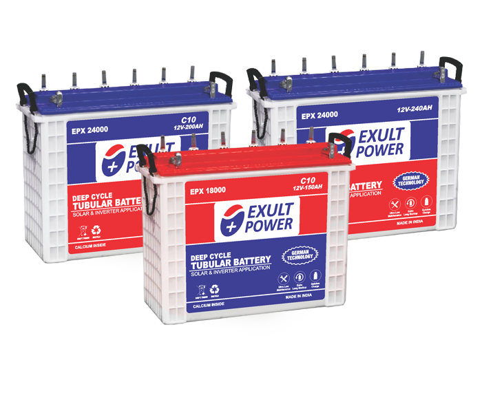 EXULT POWER offers an Extensive Range of Batteries for Solar and Non-Solar Inverters with Long Life. These and very Low Maintenance and Quick Charging that are suitable for frequent Power-Cuts. Exult Power offers batteries from 40Ah to 240Ah.